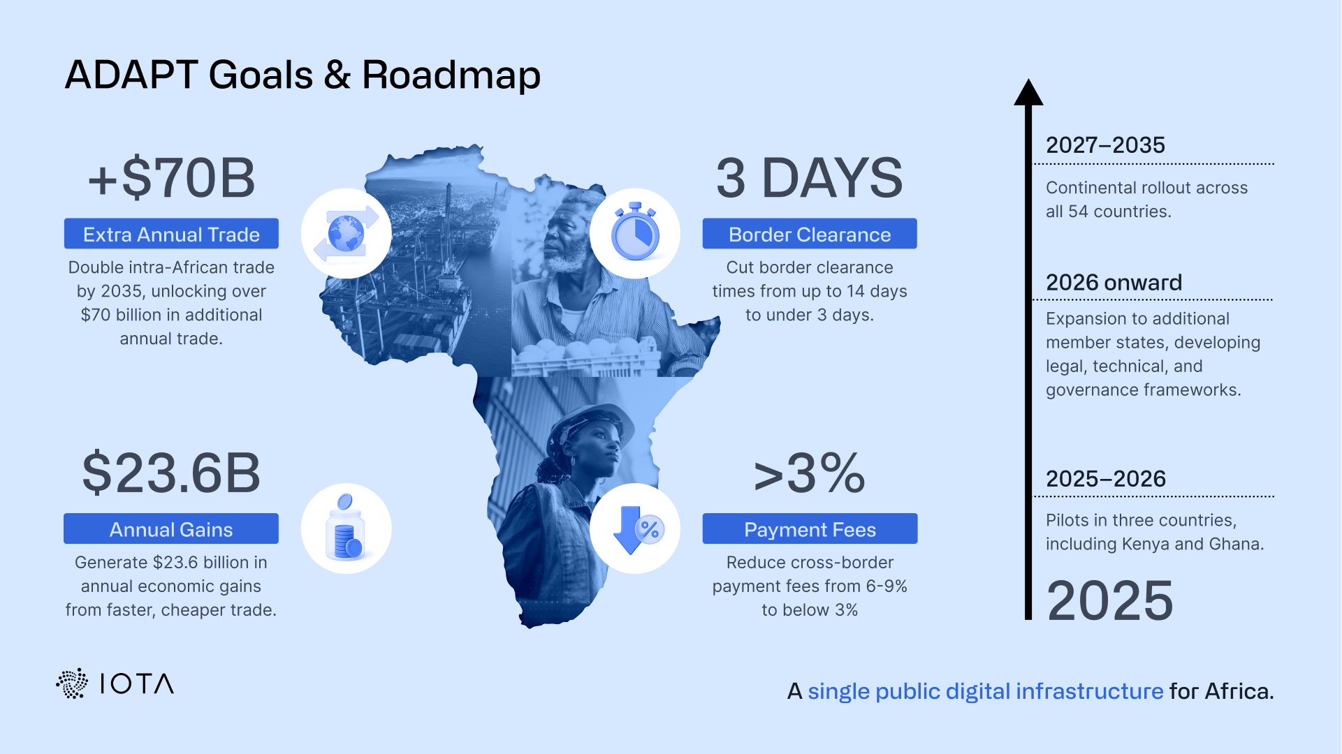 IOTA is partnering with leading international organizations to digitize how goods, data, and payments move across the continent, unlocking tens of billions of dollars in new trade value and advancing economic inclusion.