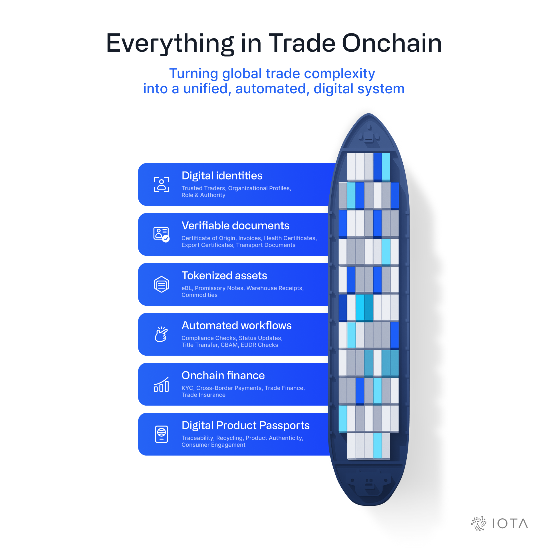 - IOTA Identity provides decentralized identifiers and verifiable credentials that establish trust between trade participants, devices, and authorities. In global trade, it enables KYC/KYB-compliant onboarding of suppliers, buyers, and intermediaries, while allowing secure and selective data sharing. Customs authorities, inspection agencies, and banks can issue digital credentials that can be instantly verified onchain. This reduces fraud, simplifies compliance, and ensures that all participants in a trade flow are authenticated and accountable.