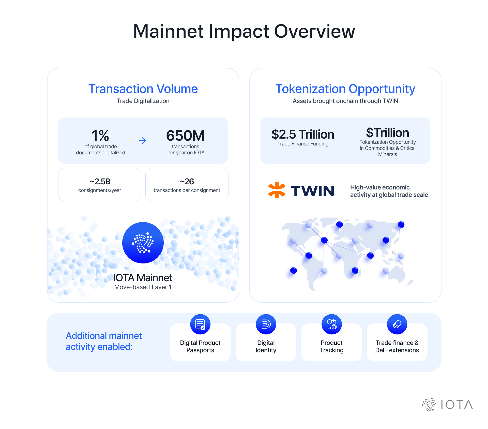 Built on the IOTA mainnet, TWIN replaces the paper-based, fragmented systems that underpin the global trade industry with a unified, verifiable, and trusted digital infrastructure. It enables governments, enterprises, and logistics providers to issue verifiable credentials, track shipments as tokenized NFTs to seamlessly exchange trade data across borders – all in real time, secure, at near-zero cost, and with full auditability. By turning physical documents and goods into onchain assets, TWIN creates the foundation for digital trade, unlocking faster customs clearance, lower shipping costs, and new financing opportunities for millions of businesses worldwide.